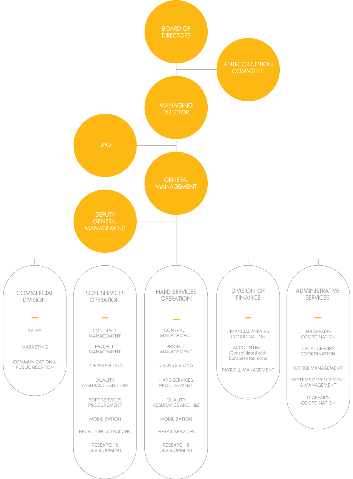 The organizational chart of ALTER EGO shows the company’s operational structure, including the defined roles and inter-departmental relationships.